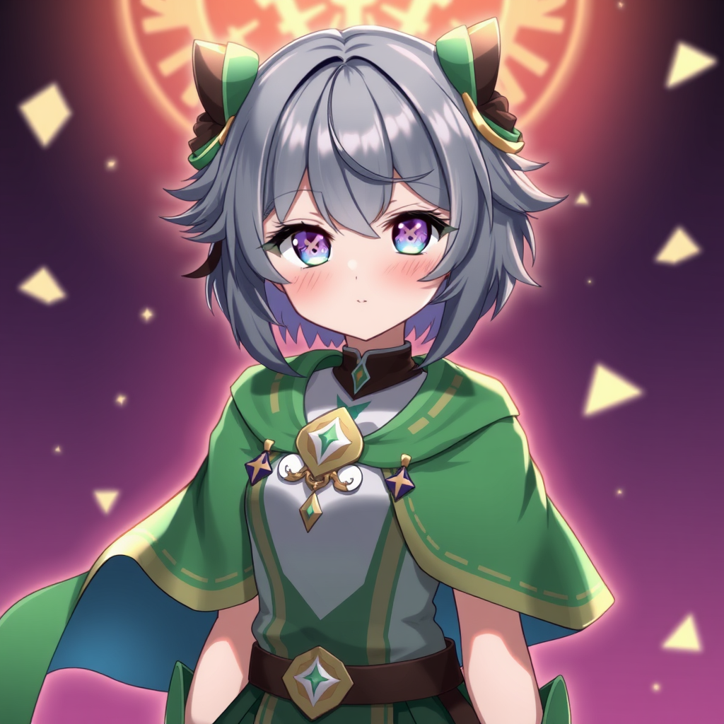 Masterpiece, high quality, single girl, solo character, Nahida from Genshin Impact, unique cross-shaped pupils, original outfit, green cape, standing pose, ultra high definition, rich colors, no visual distortions, balanced anatomy, clear focus, well-composed, immersive, seamless, digitally perfected, visually captivating, background harmony, attention to detail, sharpness, clarity, no image flaws, natural expression.