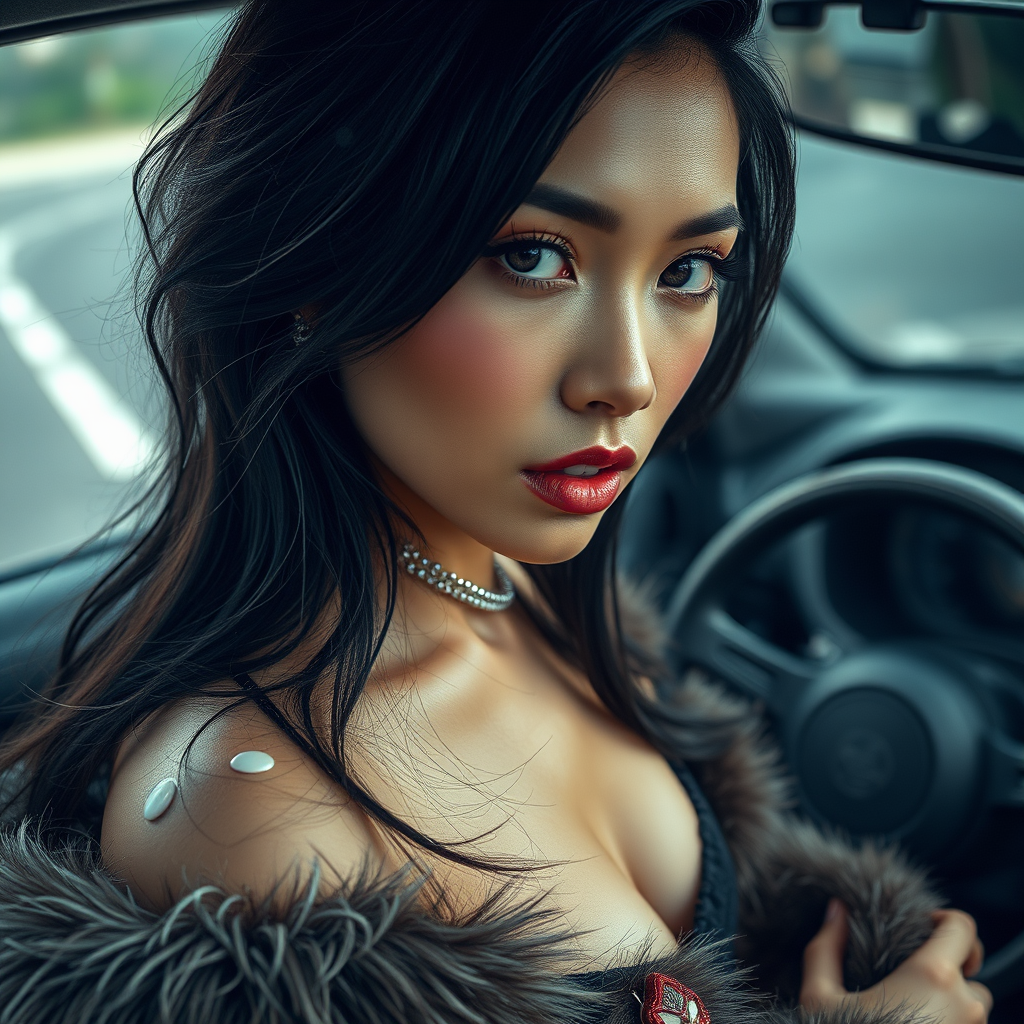 Masterpiece, high quality, single woman, direct gaze, fur detail, ebony hair, dark hosiery, gleam, splatter, moisture beads, oxidized metal, embers, asphalt, automobile, luxury sports car, high-performance vehicle, machinery, blazing, playing a musical instrument, live streaming.