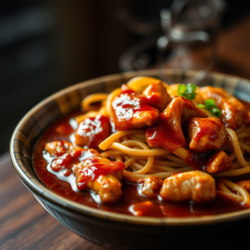 Masterpiece, high quality, Teriyaki Chicken Noodle Soup served in a deep plate, exquisite beauty, high definition close-up with bokeh effect, incredibly detailed, cinematic lighting enhancing the dish, featuring vibrant colors and textures, refined elegance, focus on the rich, glossy sauce and tender chicken. Background subtly plays with light and shadow, creating a captivating yet serene atmosphere, showcasing the artistry of culinary presentation.