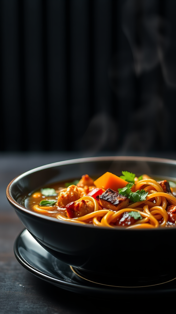 Masterpiece high-quality Teriyaki Chicken Noodle Soup served in a deep plate, highlighting exquisite beauty in a high-definition close-up. The bokeh effect enhances the cinematic lighting, creating an artistic and vibrant presentation. The focus is on the inviting colors and textures of the dish, contrasted against a sleek dark metal background, ensuring the culinary creation remains the centerpiece of attention. The serene ambiance and meticulous details emphasize mastery and quality.