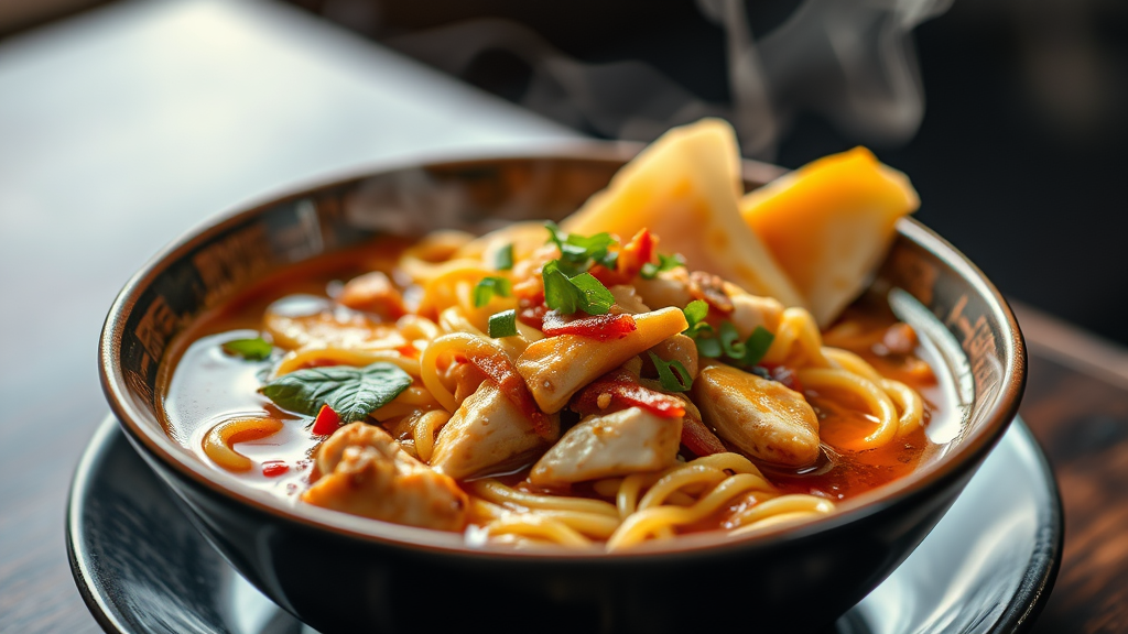 Masterpiece, high quality, Teriyaki Chicken Noodle Soup, served in an elegant, deep plate, food photography capturing exquisite beauty, high definition, close-up with soft bokeh effect, cinematic lighting enhancing the rich colors and textures, incredibly detailed, capturing the essence of culinary art, focus on the vibrant ingredients and steam rising, harmonious composition showcasing a gourmet experience.