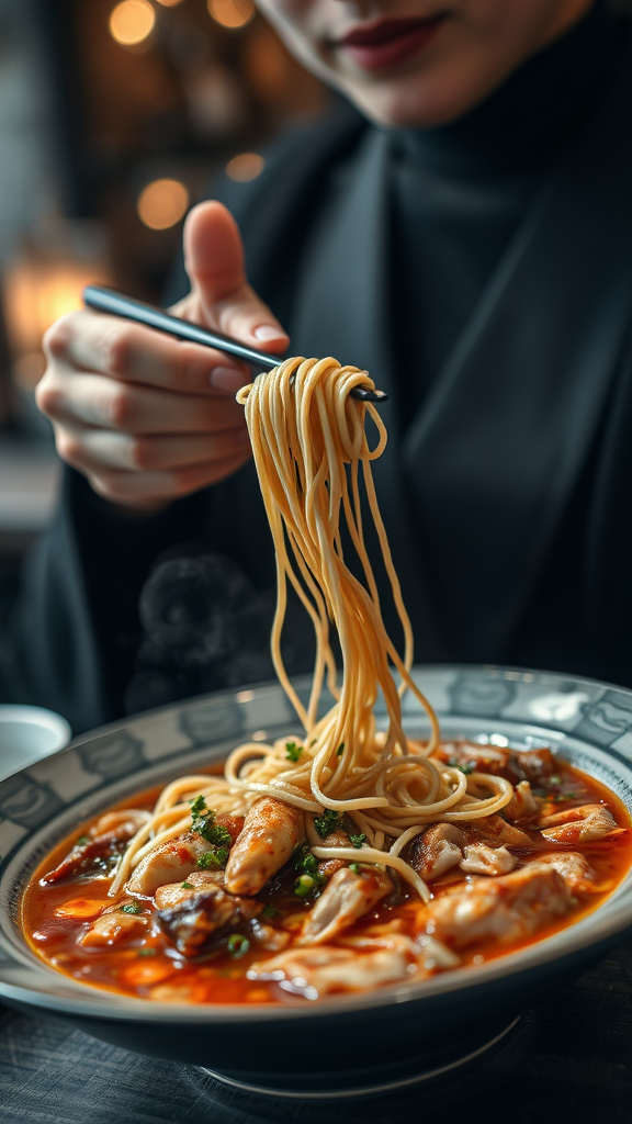 Masterpiece, high quality, Teriyaki Chicken Noodle Soup, served in an elegant deep plate, food photography capturing exquisite beauty, high definition, close-up with captivating bokeh, cinematic lighting enhancing the colors and textures, serene ambiance. Elements of dark metal providing a sophisticated contrast, person delicately enjoying the meal, clad in elegant black attire, subtle grayscale elements adding depth, showcasing an artistic dining experience.