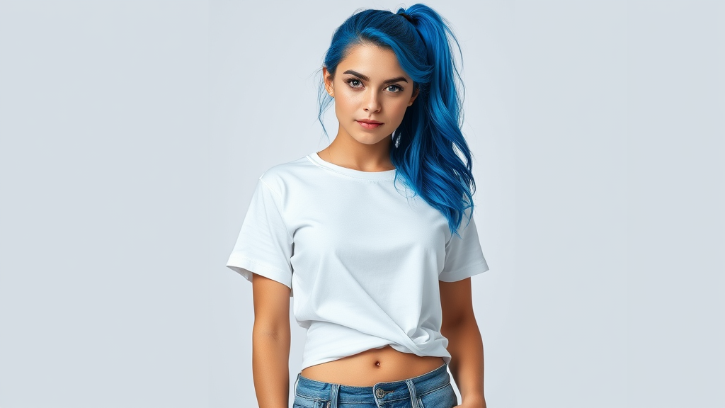 masterpiece, high quality, young woman, solo, blue hair, ponytail, bright eyes, white and blue theme, casual white T-shirt, denim shorts, medium bust, visible navel, standing pose, three-quarter shot, ultra high definition, vibrant colors, single clear subject, focused, detailed and realistic features, natural expression, balanced proportions, clear background, sharp resolution, no distortions, intact frame, pristine image quality.