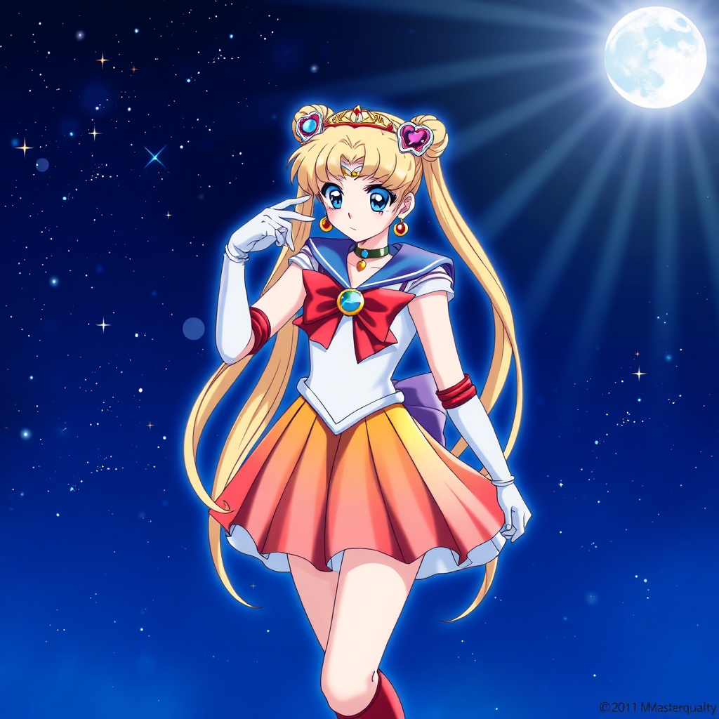Masterpiece, highest quality, Super Sailor Moon, denim-inspired theme, starlit night, moonbeam ambiance, twilight aura, elegant white gloves, vivid blue gaze, cosmic backdrop, colorful attire, sailor warrior outfit, rainbow skirt, decorative hair piece, crimson bow, jewel brooch, heart-shaped charm, delicate earrings, crescent symbol, heart pendant, elongated hair, crescent moon jewelry, regal tiara, golden necklace, stylish boots, knee-high footwear, scarlet shoes.