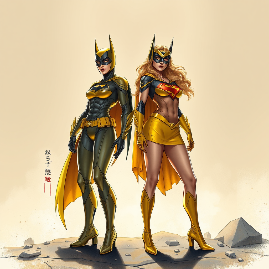 Masterpiece illustration featuring DC Comics' Batgirl and Supergirl in alternate striking yellow costumes, exuding an alluring and coy demeanor. This full-body digital illustration captures the essence of freedom and soul, inspired by the dynamic and highly detailed comic style of Kim Jung Gi. Infused with a cyberpunk edge, the artwork showcases perfect anatomy with a smooth, sharp focus, reminiscent of a watercolor painting. Drawing inspiration from the unique styles of Carne Griffiths and Wadim Kashin, this concept art is centered and poised to approach perfection. The scene is dynamic and highly detailed, crafted for a stunning visual impact worthy of award-winning recognition, making it a standout masterpiece on ArtStation.