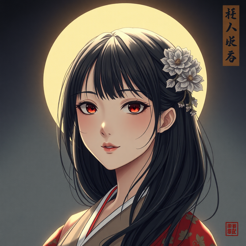 Masterpiece illustration, high quality, dramatic lighting, Ukiyo-e style, portrait of a single girl with captivating eyes, ultra high definition, HDR, 8K resolution, inspired by classical art. Avoid duplicates, maintain natural proportions, clear focus, and sharp details. Ensure the image is complete, without distortion, blurriness, or external elements like text or logos, and embodying elegance and grace in every aspect.