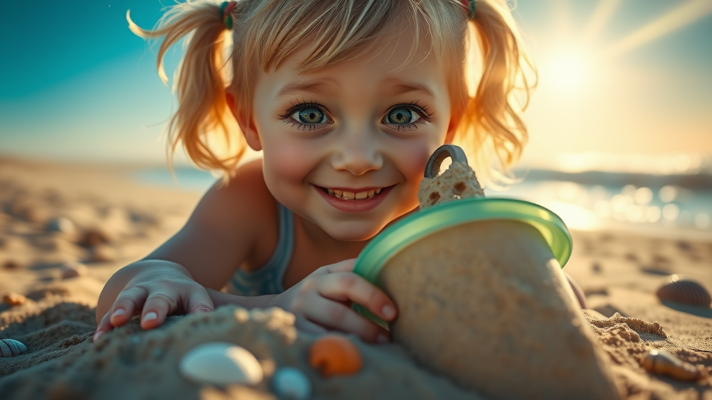 masterpiece illustration low shot closeup 1 child sitting on sand smile happy cute face extremely detailed eyes large eyes pigtails blonde hair building a sandcastle with plastic bucket dramatic lighting sunlight lens flare beach shells sea life 16k UHD HDR whimsical atmosphere slight breeze gentle waves artistic touch warm glow of sun vibrant colors playful environment serene seaside moment joyful innocence