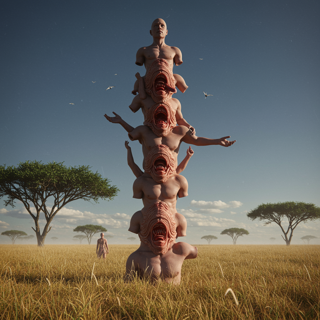 Masterpiece in the savannah, showcasing full growth with incredible detail and composition, inspired by ultra-detailed film photography with light leaks. Capturing the essence of a studio photo with intricate details, it trends on artstation. In the scene, stacked torsos create a totem pole effect, with elements of mutation and incorrect anatomy, including extra, missing, and floating limbs, depicting a surreal and thought-provoking landscape. The artwork embraces the concept of disconnection and mutation, resulting in a striking yet unsettling image that lingers in the viewer's mind.