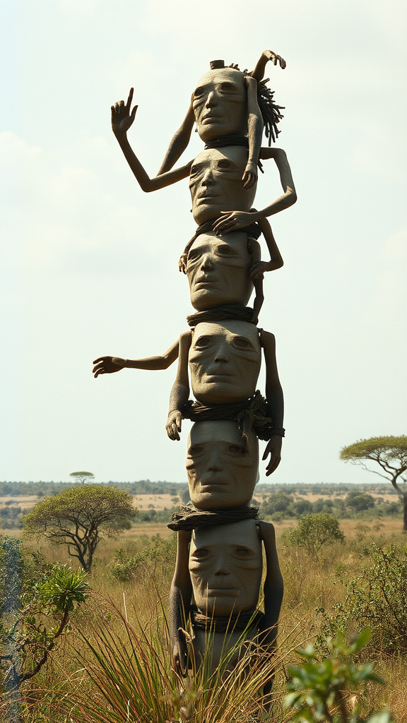 Masterpiece in the savannah, showcasing the full growth of nature with incredible and intricate composition. Captured with an ultra-detailed film photography style, enhanced by natural light leaks, and reminiscent of trending art pieces. The image features surrealistic totem-like structures made of stacked torsos with unusual anatomy, including extra and missing limbs. Limbs appear to float in a bizarre, mutated form, creating an abstract and intriguing visual. The scene is both fascinating and unsettling, with elements of distortion and mutation, evoking a sense of curious beauty amidst chaos.