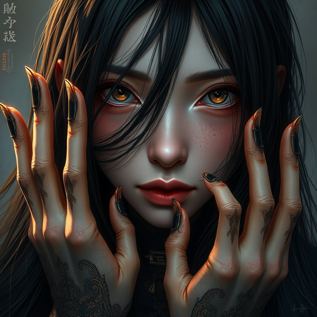Masterpiece, intricate details, trending on ArtStation, cinematic lighting, ultra resolution, 1girl with long black hair, art inspired by Ruan Jia, Greg Rutkowski, and Anato Finnstark, set in a fantasy ambiance with a medieval touch, highly detailed face, surreal and abstract elements like duplicated and distorted eyes, unusual hand forms with extra fingers, capturing a unique and otherworldly appearance, atmospheric and imaginative encapsulation in a visually striking composition.