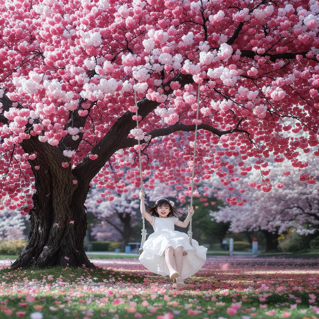View this AI-generated image featuring masterpiece of a girl joyfully swinging under a majestic tree encompassed by a vivid sea of colorful spring blossoms captured with high quality and enhanced by soft volumetric lighting the image boasts clarity and precision free of distortions and imperfections