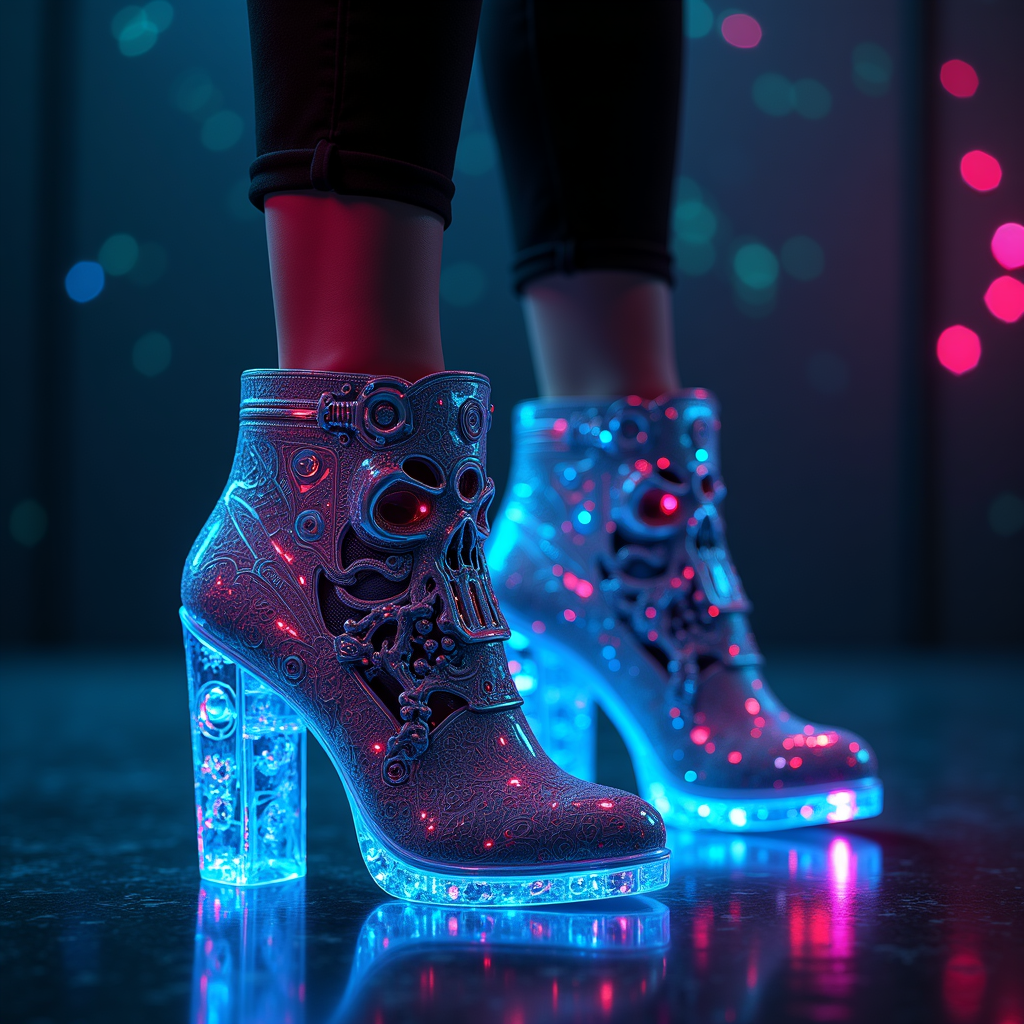 A cyberpunk-themed masterpiece featuring a female model showcasing biomech cyberpunk skull ankle boots. The scene is captured in a realistic photo with perfect anatomy and is presented in 32k UHD resolution. The image boasts vibrant, vivid colors with highly detailed textures and a dynamic depth of field. The biomech design is infused with fractal patterns, exuding a futuristic and edgy aesthetic. The boots feature glowing crystal-clear elements cascading with an ethereal light. The overall composition reflects professional photography, emphasizing both creativity and technical prowess, delivering an ultra-high-definition, hyper-realistic visual experience.