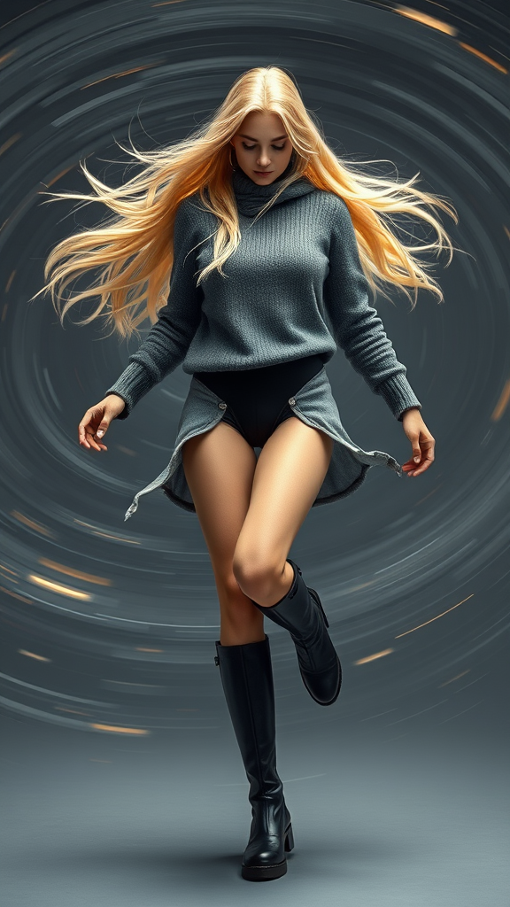 Masterpiece of best quality featuring Agrias with long blonde hair, wearing a grey sweater over a black leotard, twirling and spinning with superhero flair, her bare legs accentuated by high boots. She becomes a whirlwind, spinning fast as if transforming into a tornado. She stands alone, surrounded by dynamic wind effects, as if traveling through time with every powerful spin, embodying the essence of movement and time travel in perfect harmony.