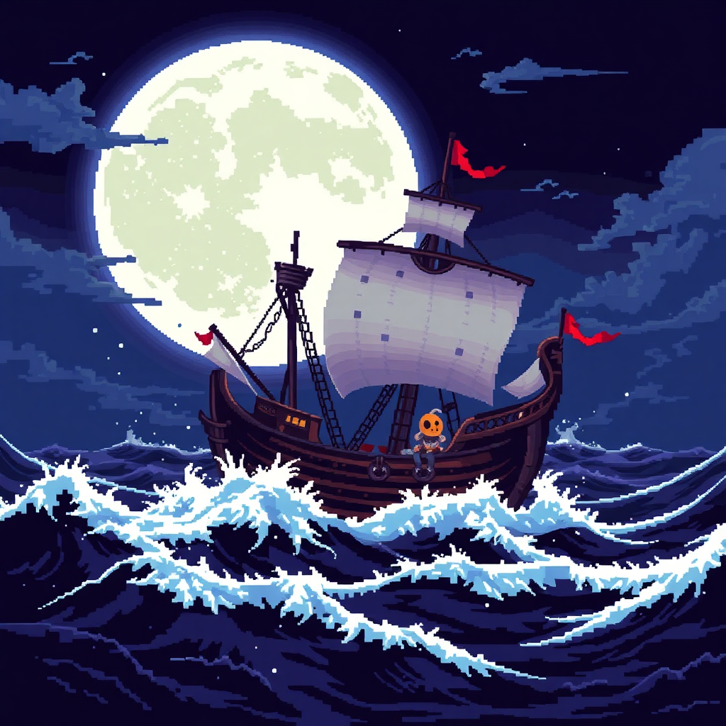 Masterpiece of retro gaming 2D pixel art featuring an eerie ghost ship navigating through moonlit ocean waves, exquisite pixel detail, vibrant 2D style, high resolution with perfect execution, dynamic high contrast for visual brilliance and extremely refined quality.