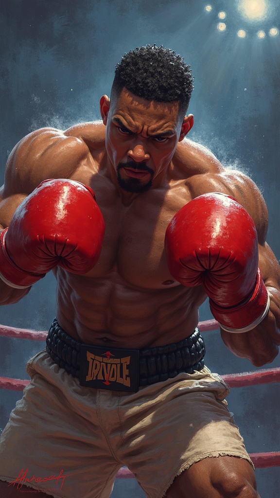View this AI-generated image featuring a stunning masterpiece painting of a man in a boxing ring capturing the intensity and power of an anime inspired illustration the scene is hyper detailed as if trending on artstation with influences from artists like jazza rossdraws kawacy and sachin teng the m
