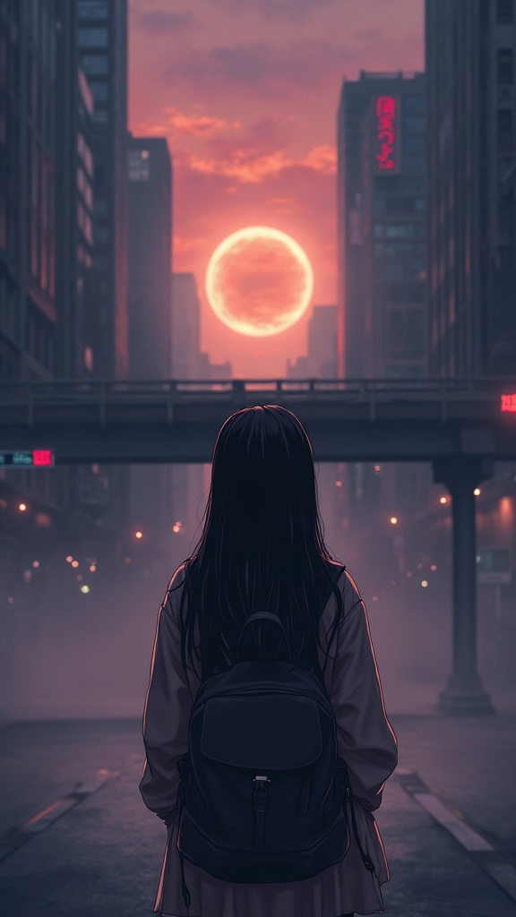 View this AI-generated image featuring masterpiece premium quality flat color minimal palette subdued contrast 1girl long sleek black hair radiant halo rucksack looking aside standing mist twilight sky metropolis dusk tall buildings overpass street signs spatial depth frame ebony crimson amber chest