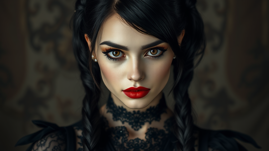 Masterpiece quality, focused on a single woman, capturing intricate details and depth with dramatic shadowing, showcasing an extremely detailed lady with captivating eyes and vivid red lipstick, emphasizing a natural look without black eyeliner. She is adorned in exquisitely detailed gothic clothing featuring black lace, and her black hair is styled in elegant ponytails. The hyper-realistic portrayal appears as if captured with a Nikon D850, enhanced with real-life texture and dramatic lighting, reminiscent of Unreal Engine's capabilities. The gothic style is accentuated by tattoos, adding to her mysterious allure, while maintaining the essence of a high-quality, visually striking image.