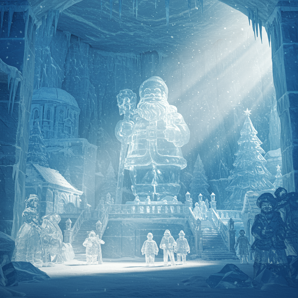 A breathtaking masterpiece rendered in 8k, depicting a hyper-realistic world sculpted entirely from ice, where every element is a stunning ice creation: magnificent ice sculptures, intricate ice architecture, and exquisite ice flora populate this frozen realm. At the heart of this icy utopia stands a grand, crystal-clear ice Santa Claus statue, brilliantly capturing the essence of artistry. Sunlight pierces through the transparent ice, casting vibrant prisms of color and illuminating the scene with a mesmerizing brilliance. Surrounding the statue, ice characters bustle in this sparkling wonderland, contributing to the ethereal and enchanting atmosphere of this frozen paradise.