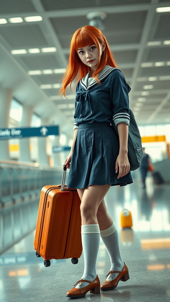 Masterpiece scene capturing a woman with vibrant orange hair holding a suitcase, inspired by the artistry of Harriet Powers and trending on CG Society. This digital art illustrates a hyperrealistic schoolgirl in a magical academy uniform, featuring a skirt and high socks. Her appearance is reminiscent of a scene from a live-action film, evoking a sense of narrative and storytelling. The airport interior serves as a dynamic background, emphasizing her journey and adding depth to the composition.
