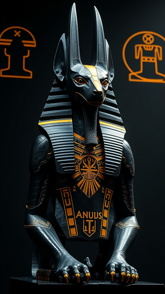 Masterpiece sculpture of Anubis "God of Death" in a futuristic reinterpretation, avant-Egyptian style. The monumental god figure is intricately detailed and forward-thinking, sculpted from black granite with an ultra-smooth finish and highlighted by gold inlays. The design is modular and adorned with sacred hieroglyphs. Set against a dark background, there are dimly projected Egyptian symbols made of light, creating a grandiose yet solemn atmosphere. Captured in a portrait shot with center focus, the sculpture exhibits laser-cut precision and hyper-detailing, embodying a sci-fi, futuristic-avant-Egyptian aesthetic.
