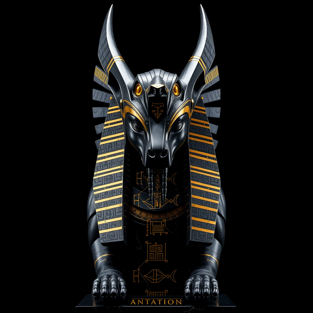Masterpiece sculpture of Anubis, the God of Death, reimagined in a futuristic, avant-Egyptian style. The Monumental god figure is intricately complex and embodies a futuristic essence. Crafted from black granite with an ultra-smooth finish, it features gold inlays and modular sacred hieroglyphs. Set against a dark background, dim Egyptian symbology is projected as light. The composition is grand and sober, with a center-focused portrait shot, showcasing laser-cut hyper-detail in a sci-fi, futuristic-avant-Egyptian manner.