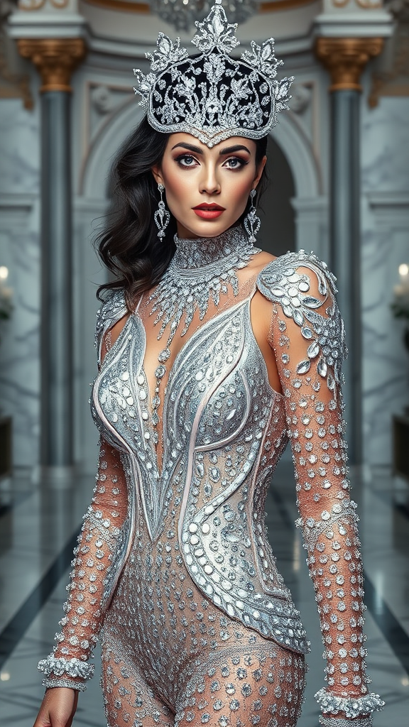 Masterpiece, stunning full body portrait of an exquisite woman adorned in a dazzling outfit made of Swarovski crystals, exuding sultry elegance, set in a grand white marble hall, inspired by the style of Swarovski, with highly intricate and detailed elements, cinematic and hyper-realistic appearance, showcasing vibrant colors and volumetric lighting. Influenced by the works of Joyce Ballantyne Brand, David Klein, Roberto Cavalli, and Saul Bass, with retouching by Pratik Naik, captured using a Sony Alpha 1 camera, 85mm lens, f/1.4 aperture, 1/500 shutter speed, ISO 100 film, presented in ultra-high definition HDR, 8k, 16k, 32k resolution.