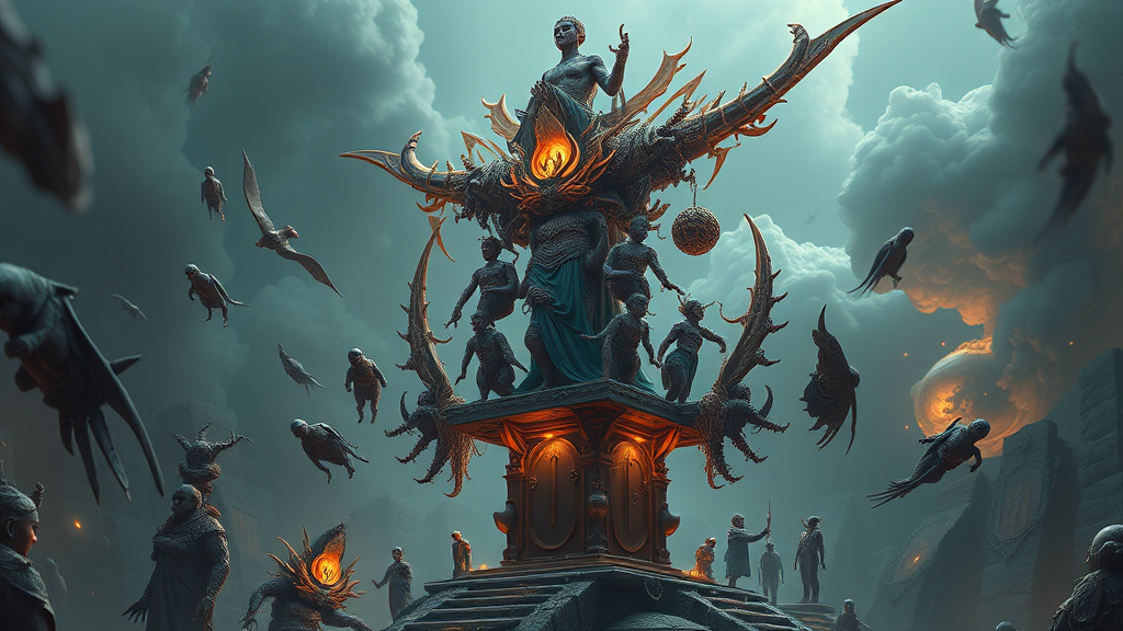 Masterpiece, stunning quality, intricate details, composition, ultra-detailed, light effects, trending on artstation, sharp focus, surreal aesthetics, stacked figures, abstract totem structure, unconventional anatomy, bizarre form, additional elements, incomplete form, levitating parts, disjointed appearance, evolving design, abstract mutation, visually striking, enigmatic, dreamlike essence, imaginative transformation, nfixer aesthetics.
