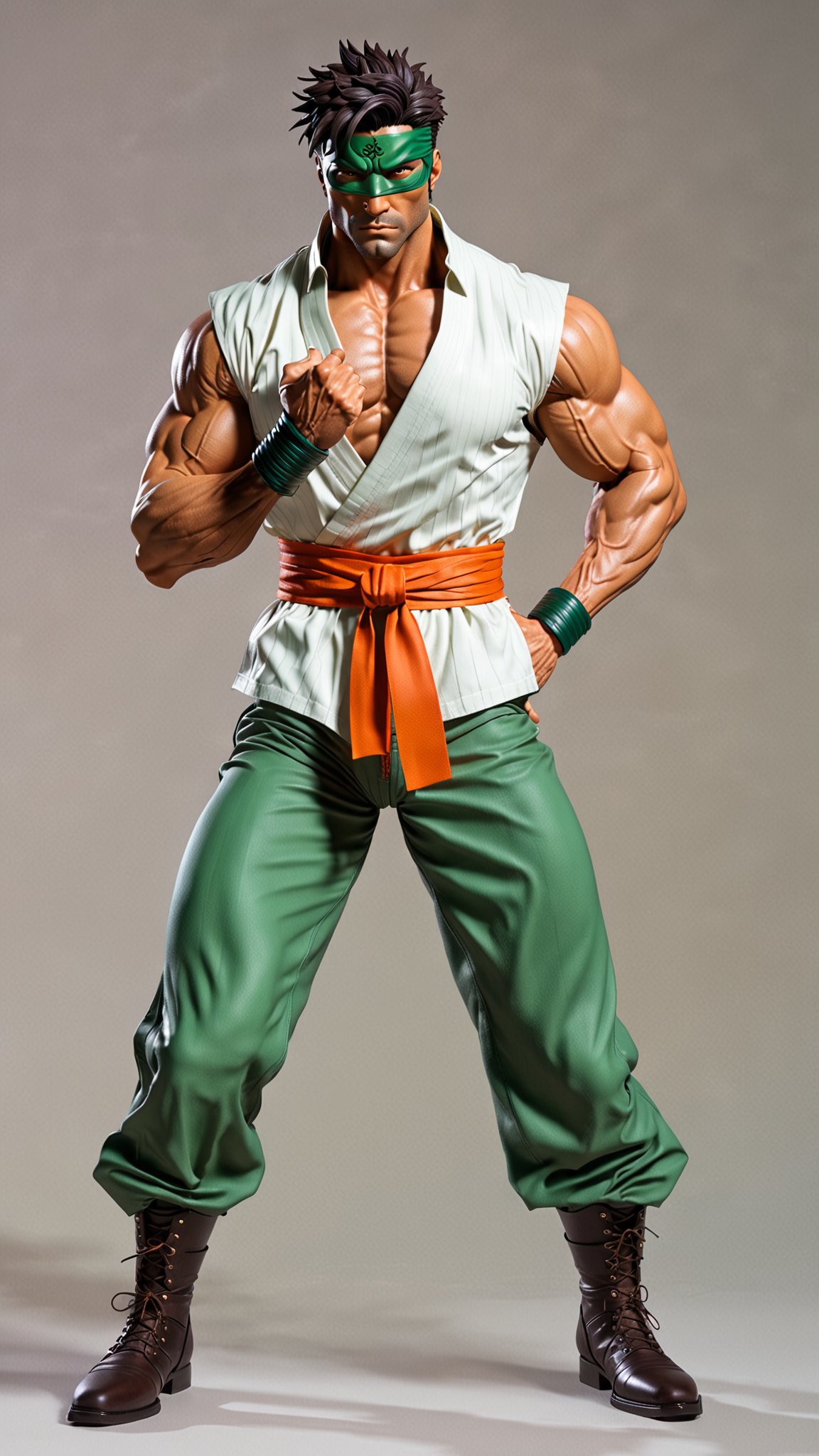 (((Masterpiece))) Super-hero, martial artist, street fighter. He absorbs sunlight and uses it to power his hits and strikes-- his hands glow with power. It also gives him some invulnerability. He keeps a praying mantis as a mascot. Hypermasculine male superhero, Caucasian male of European descent (((white male))), martial artist. White male, short black hair fade style. strong jaw and brow, chiseled squared jaw, soul patch on face. Dark brown eyes, intense gaze. Jade green soft cloth super-hero mask covering top of head and eyes, tied in back his head. Mask covers eyes and top of head, leaving the mouth and jaw area open. Muscular, sinewy, athletic, strong. Loose fitting outfit, solid jade green with bright orange trim on the sides of the top, stripes down the sides of the pants. Form fitting top, deep plunging neckline and open on the sides, exposing his arms and sides. Yin-Yang symbol on outfit. Bare arms, shirt open. Jade green wraps around forearms. Baggy pants, bottoms stuffed into boots. Long orange sash around the waist, jade green ninja boots. Can harness solar power, light strikes on impact. Full body pose, fighting action. Praying Mantis as a friend and mascot.