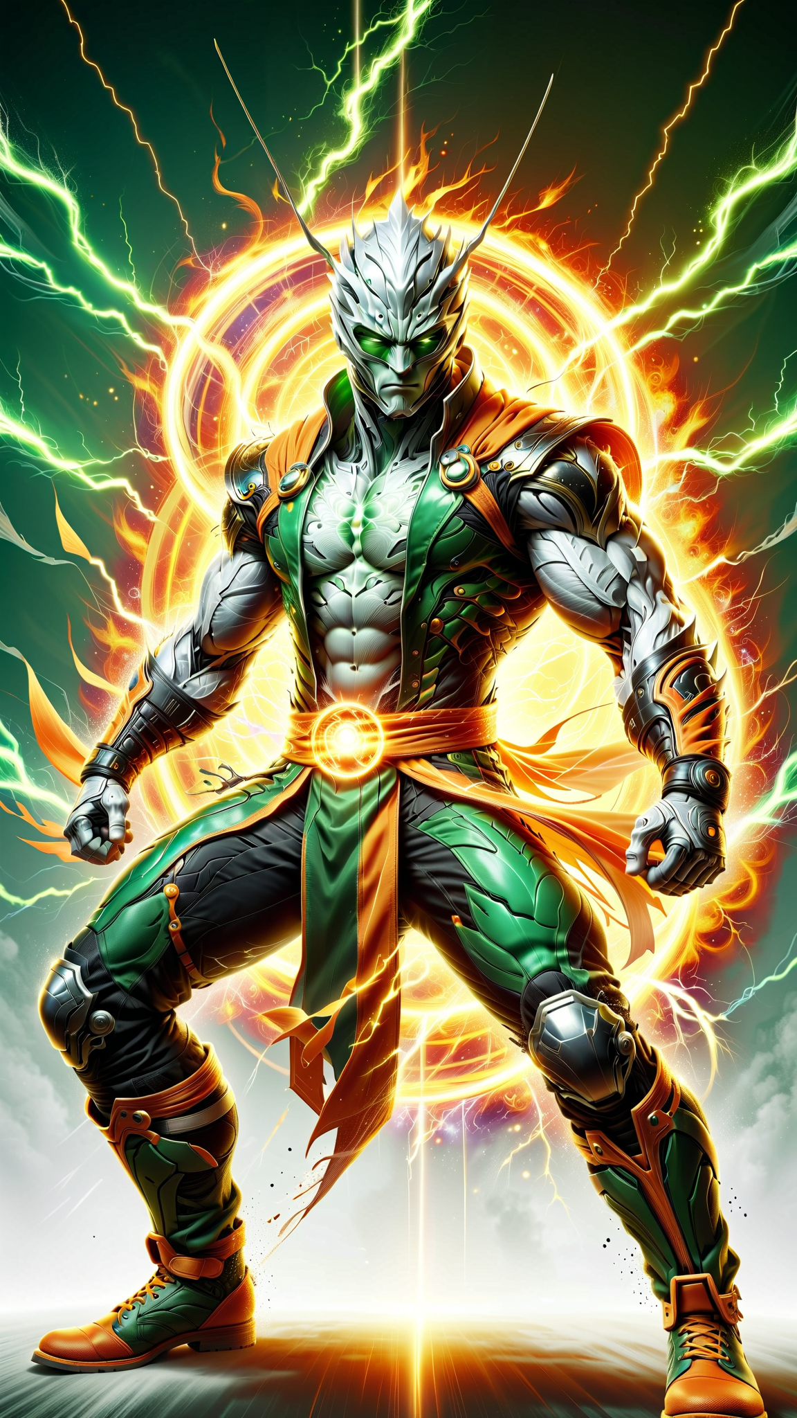 (((Masterpiece))) Super-hero, martial artist, street fighter. He absorbs sunlight and uses it to power his hits and strikes-- his hands glow with power. It also gives him some invulnerability. He keeps a praying mantis as a mascot. Hypermasculine male superhero, Caucasian male of European descent (((white male))), martial artist. White male, short black hair fade style. strong jaw and brow, chiseled squared jaw, soul patch on face. Dark brown eyes, intense gaze. Jade green soft cloth super-hero mask covering top of head and eyes, tied in back his head. Mask covers eyes and top of head, leaving the mouth and jaw area exposed. Muscular, sinewy, athletic, strong. Loose fitting outfit, solid jade green with bright orange trim on the sides of the top, stripes down the sides of the pants. Form fitting top, deep plunging neckline and open on the sides, exposing his arms and sides. Yin-Yang symbol on outfit. Bare arms, shirt open. Jade green wraps around forearms. Baggy pants, bottoms stuffed into boots. Long orange sash around the waist, jade green ninja boots. Can harness solar power, light strikes on impact. Full body pose, fighting action. Praying Mantis as a friend and mascot.