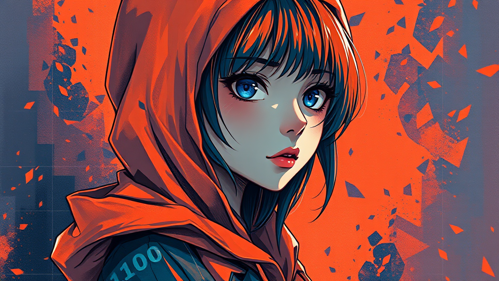 Masterpiece, surrealism, exquisite detail, anime-inspired, portrait of a lone girl, vibrant orange and blue tones, clad in a hoodie with bold brushstrokes, binary code overlay, painterly finish, intense inking, showcased on Pixiv, rich in saturated colors, striking red and blue contrasts, pixel elements, hypercube visuals, pixel sorting, grand composition and proportions, dynamic and dramatic lighting, high definition clarity.