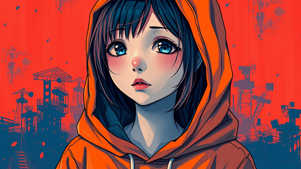 Masterpiece, surrealism, intricately detailed, anime style, a portrait of a lone girl, vibrant orange and deep blue color palette, donned in a hoodie with bold brushstrokes, infused with a digital binary code motif, soft painting textures, pronounced inking, showcased on an artist platform, vivid colors, contrasting hues of red and blue, pixelated elements, dimensional hypercube, pixel distortion, grand composition, impressive scale, dynamic illumination, high definition quality.