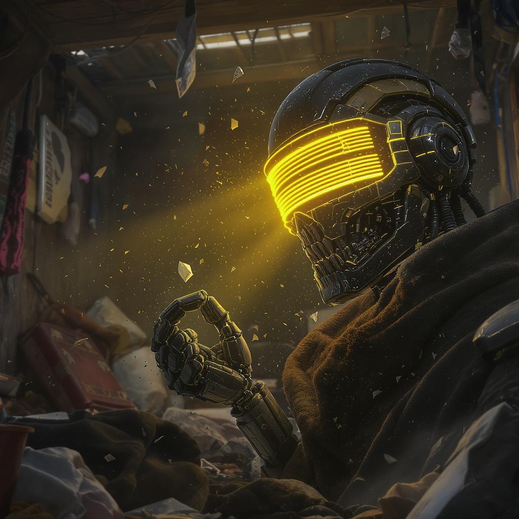 Masterpiece, top-notch quality, ultra high resolution, wide angle shot of a cluttered and disorganized shack, high-action dynamic scene reminiscent of League of Legends, vivid and lifelike with a touch of realism. A robot shattered into fragments with a glowing yellow visor, styled as a sci-fi cyberpunk gangster. Captured in medium shot with intricate details as if rendered in Unreal Engine, cozy indoor illumination, detailed like a James Gurney scene meets the visionary style of Katsuhiro Otomo. Dramatic cinematic lighting, infused with vibrant elements of nature, crafted by Craig Mullins and Greg Rutkowski. Featuring volumetric lighting effects, trending aesthetics similar to those on ArtStation, with the precision of octane rendering and sharp focus akin to studio photography. Imbued with the intricate detailing found in Cyber 2077, offering a fresh yet faithful interpretation of the core theme.