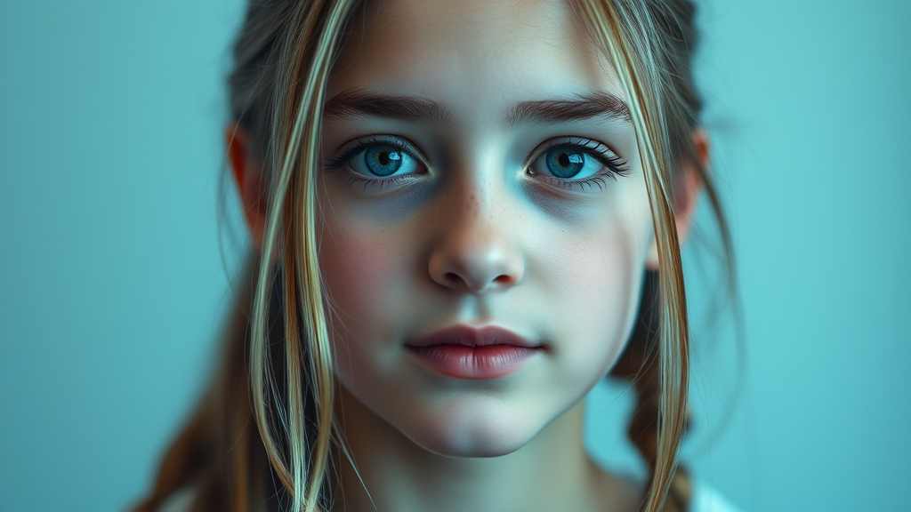 Masterpiece, top-quality portrait of a teenage girl with a serene expression, featuring a cool color palette with hints of soft blues and purples. 8k resolution, ultra-high definition, high dynamic range, capturing intricate details and a gentle interplay of light and shadow.