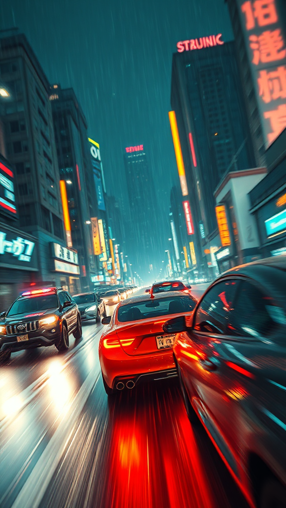 Masterpiece, top-tier action movie poster featuring a thrilling race through a futuristic cyberpunk cityscape illuminated by neon lights at night. The scene captures vehicles at incredible high speeds, with streaking motion blur highlighting their velocity. In the midst of a torrential rainstorm, cinematic lighting enhances the depth and intensity of the visual, while elements of bokeh magnify the atmospheric effect. The shot is captured in extreme detail, utilizing 8k UHD HDR technology, reminiscent of a RAW candid cinema style. The image has been color graded with a portra 400 film aesthetic, shot on a cinematic camera like the FujiFilm XT3, showcasing remarkable color and impeccably detailed imagery.