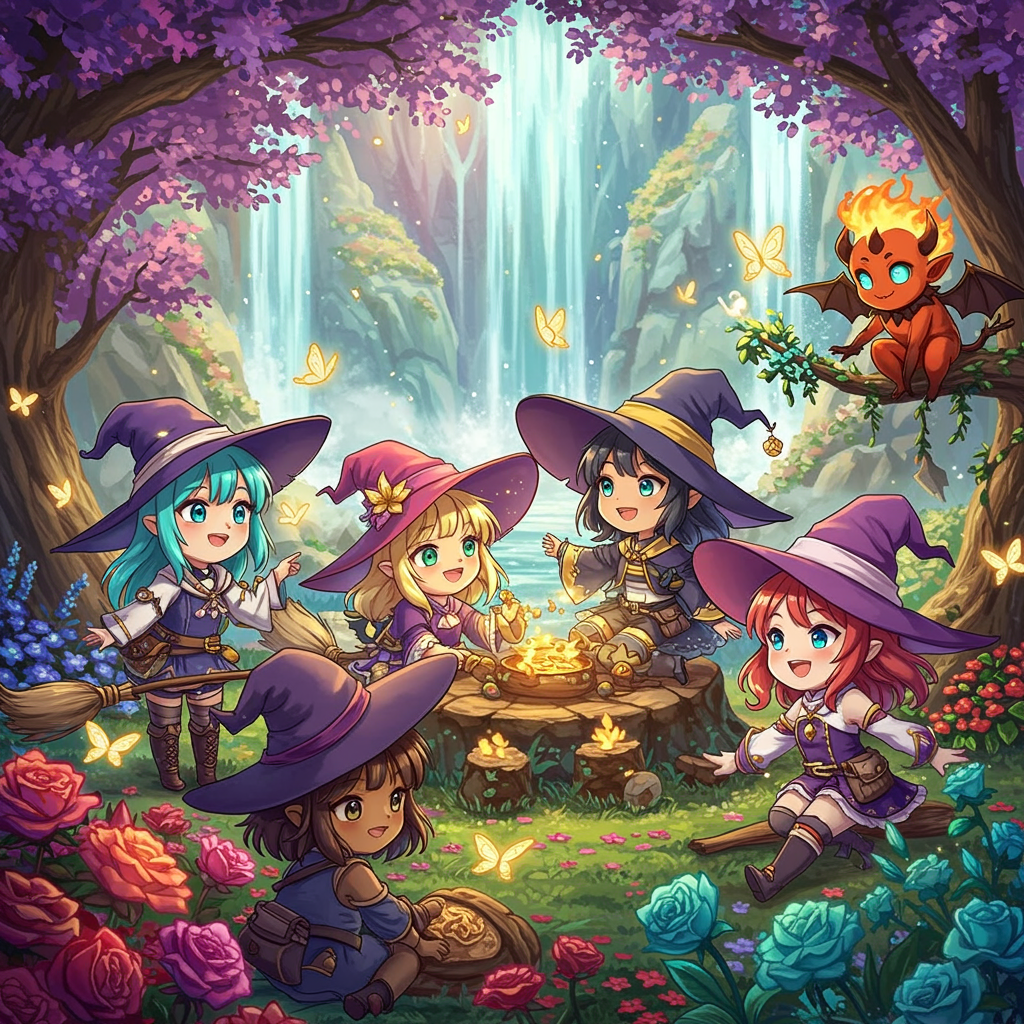 Masterpiece, top-tier quality, adorable chibi, enchanting witch gathering, joyful, lively, bursting with colors.