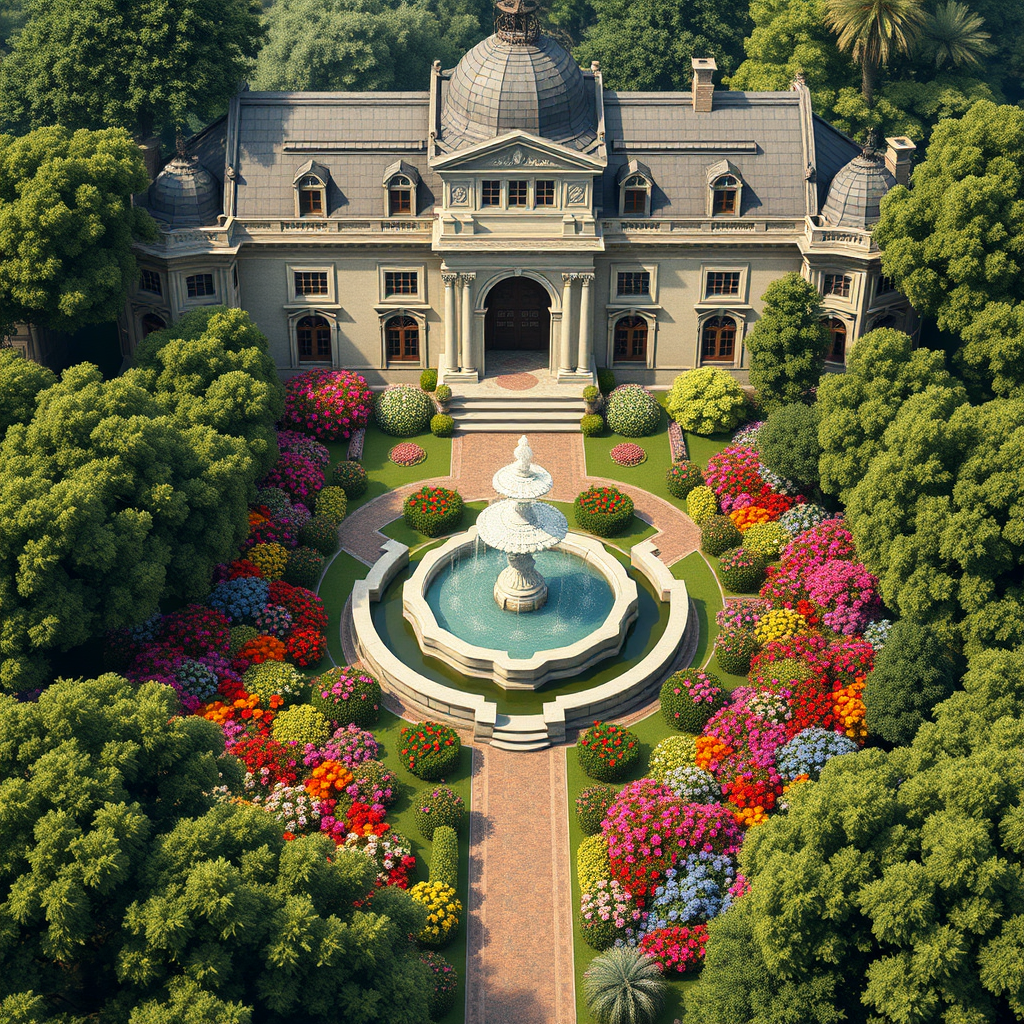 Masterpiece, top-tier quality, an ancient estate featuring a stunning central garden fountain, a vibrant garden teeming with a spectrum of colorful blooms encircled by lush trees, isometric 3D perspective, rendered with octane, employing ray tracing, hyper-detailed and immersive, version 6.