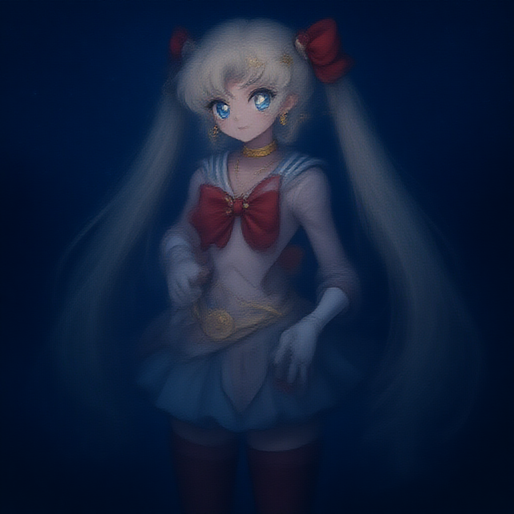 Masterpiece, top-tier quality, super sailor moon, evening denim shot under the night sky, illuminated by moonlight, adorned in white gloves, blue eyes that mirror the galaxy background, wearing multicolored sailor senshi attire with a vibrant skirt, embellished with a detailed hair ornament, featuring a striking red bow, heart-shaped brooch, crescent moon earrings, and intricate earrings. Her very long hair flows elegantly, shimmering under a delicate tiara. A heart necklace and yellow choker complete the look, complemented by stylish knee-high boots in red.
