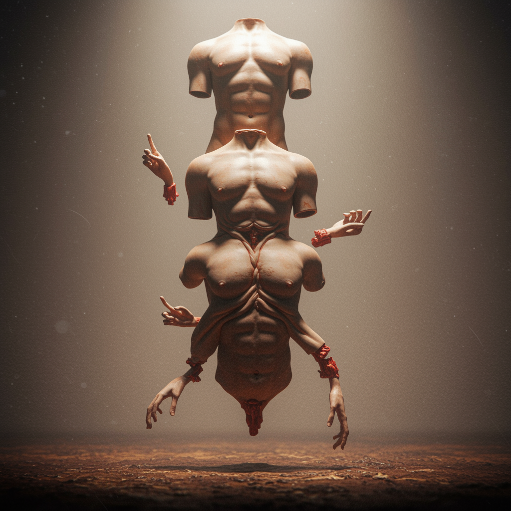 Masterpiece, unparalleled quality, exquisite detail, highly intricate, sophisticated composition, ultra-refined, ethereal light leaks, trending on art platforms, razor-sharp focus, high resolution, stacked torsos, totem-like structure, awkwardly drawn, incorrect anatomy, bizarre anatomy, surplus limb, absent limb, levitating limbs, disconnected limbs, peculiar mutations, grotesque, unsettling, hazy, amputated, surreal fixer, art rectifier, creation enhancer.