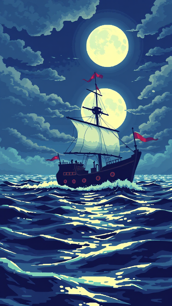 Masterpiece, Vintage arcade-style pixel art featuring a spectral ship navigating moonlit seas, exceptional pixel clarity, dynamic 2D aesthetic, ultra-high resolution, flawless depiction, striking contrast for visual sharpness, top-tier quality.