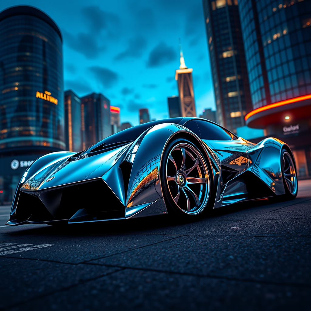 masterpiece wallpaper of a futuristic car, gleaming chrome, urban skyline, low angle view, intricate design, sleek and sophisticated, highly detailed, digital painting, artstation, concept art, smooth finish, sharp focus, illustration, art reminiscent of artgerm, greg rutkowski, and alphonse mucha influence, 8k resolution, subtle enhancements for visual impact