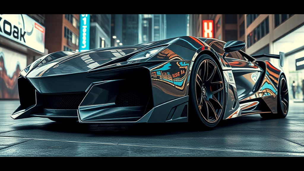 masterpiece wallpaper of a futuristic car, gleaming metal surfaces, urban environment, low angle perspective, intricate and sophisticated design, highly detailed digital painting, artstation aesthetic, concept art, seamless blend of elegance, sharp focus, illustration, inspired by the styles of artgerm, greg rutkowski, and alphonse mucha, rendered in 8k with emphasis on clarity and striking visual impact.