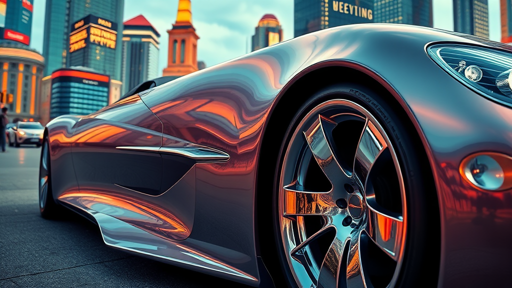 Masterpiece wallpaper of a sleek modern car with polished, gleaming metal surfaces, set against a vibrant cityscape. The low angle perspective highlights its elegance and intricate design. Rendered in highly detailed digital painting style, this art piece is inspired by Artstation concept art and bears influences from masters like Artgerm, Greg Rutkowski, and Alphonse Mucha. The composition is smooth yet sharply focused, capturing the essence of refined craftsmanship. Created in stunning 8k resolution for a truly immersive visual experience.