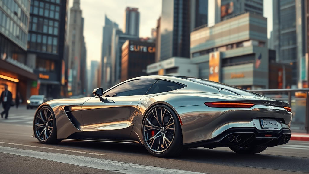 Masterpiece wallpaper of a sleek modern car with shimmering metallic surfaces set against a bustling cityscape, captured from a low vantage point; the image showcases intricate and elegant detailing, with a highly detailed digital painting style reminiscent of ArtStation concept art. The composition embodies a smooth yet sharp focus, echoing the illustrative finesse of artists like Artgerm, Greg Rutkowski, and Alphonse Mucha, rendered in stunning 8k resolution. The scene is freshened with subtle creative twists, maintaining the core essence of elegance and modernity.