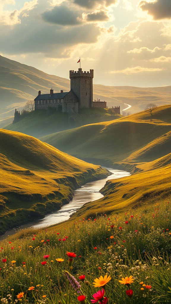 mdjrny-v4 style, a tranquil medieval countryside with rolling hills and a majestic stone English castle rising in the distance, ethereal atmosphere, hyper realistic, 8k resolution, grand composition, cinematic essence, rendered with octane's luminous touch, inspired by the landscape photography of Carr Clifton, a gentle river winding through the scene, golden light of the setting sun casting long shadows, vibrant wildflowers contrasting with the lush greenery.