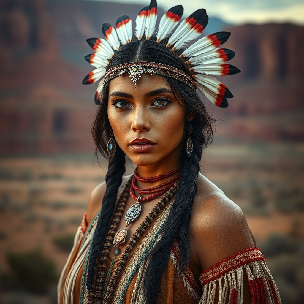 mdjrny-v4 style portrait photograph of a young beautiful Native American woman resembling Madison Beer as Pocahontas, with a perfectly symmetrical face adorned with intricate feather jewelry, wearing a traditional handmade dress. She exudes the strength of an armed hunter warrior, set against a breathtaking Utah landscape. The scene is ultra realistic, blending concept art with elegance, showcasing depth of field and an 8k resolution. Influences from artists like Artgerm, Greg Rutkowski, and Alphonse Mucha are reflected in the exquisite detailing and stylistic choices.