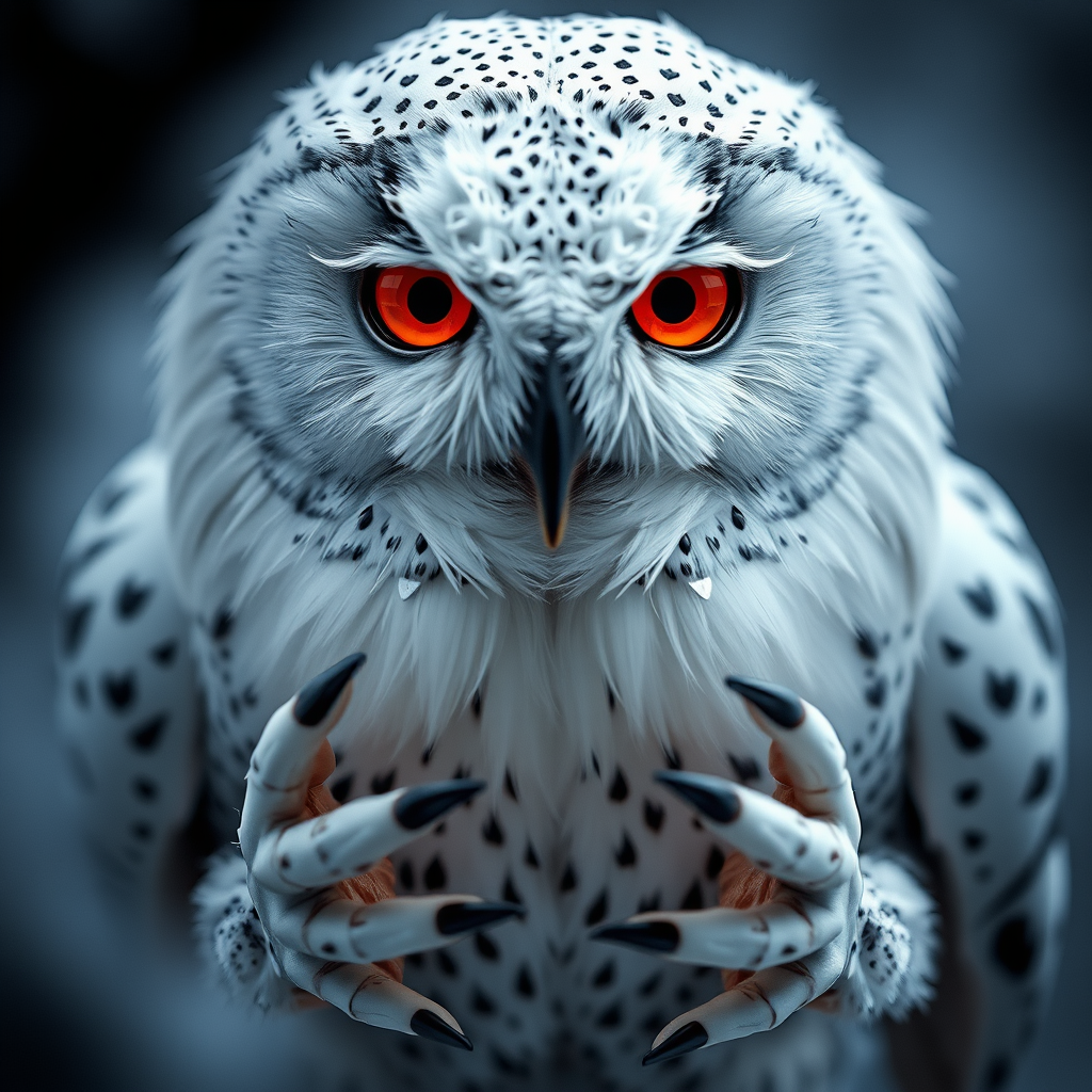 mdjrny-v4 style, high definition photo of a mystical snow owl by Marta Bevacqua and Guy Aroch, Peter Coulson cgi, 3d model, doll-like features, rendered with octane, striking red eyes, airbrushed texture, surreal and fantastical anatomy, slightly blurred and hazy edges, mysterious and whimsical appearance, extra limbs subtly integrated, elegantly distorted hands, abstract composition, partially out of frame for an enigmatic feel, dreamlike and otherworldly.