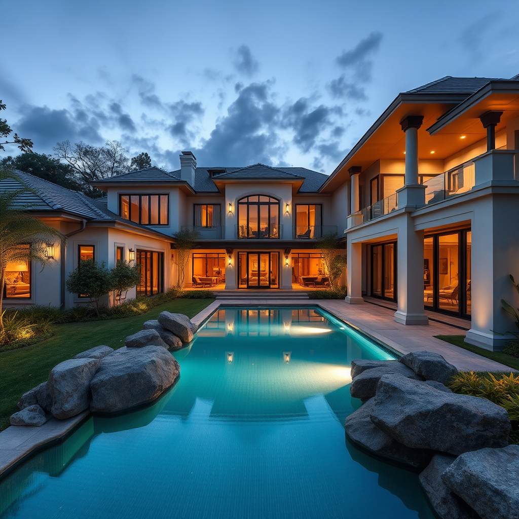 mdjrny-v4 style high-resolution photography capturing the architecture of a luxurious house, blending modern and classic design elements. The scene features a sleek, pristine pool surrounded by natural rocks, lush greenery accentuating the elegance, and a twilight sky casting a serene ambiance over the property.