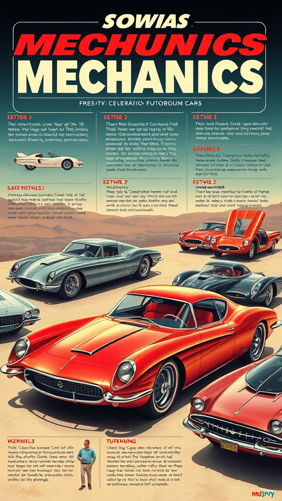 mdjrny-v4 style highly detailed infographic showcasing retrofuturism cars featured in a popular mechanics magazine, capturing a vintage vibe with intricate details. The digital art depicts concept cars with sleek designs, chrome finishes, and classic elements. The poster exudes an award-winning quality with a focus on max detail, blending the aesthetics of mid-century futurism with modern-day digital painting techniques. Vibrant colors and engaging layouts bring the imagined world of tomorrow's automobiles to life, sparking both nostalgia and wonder.