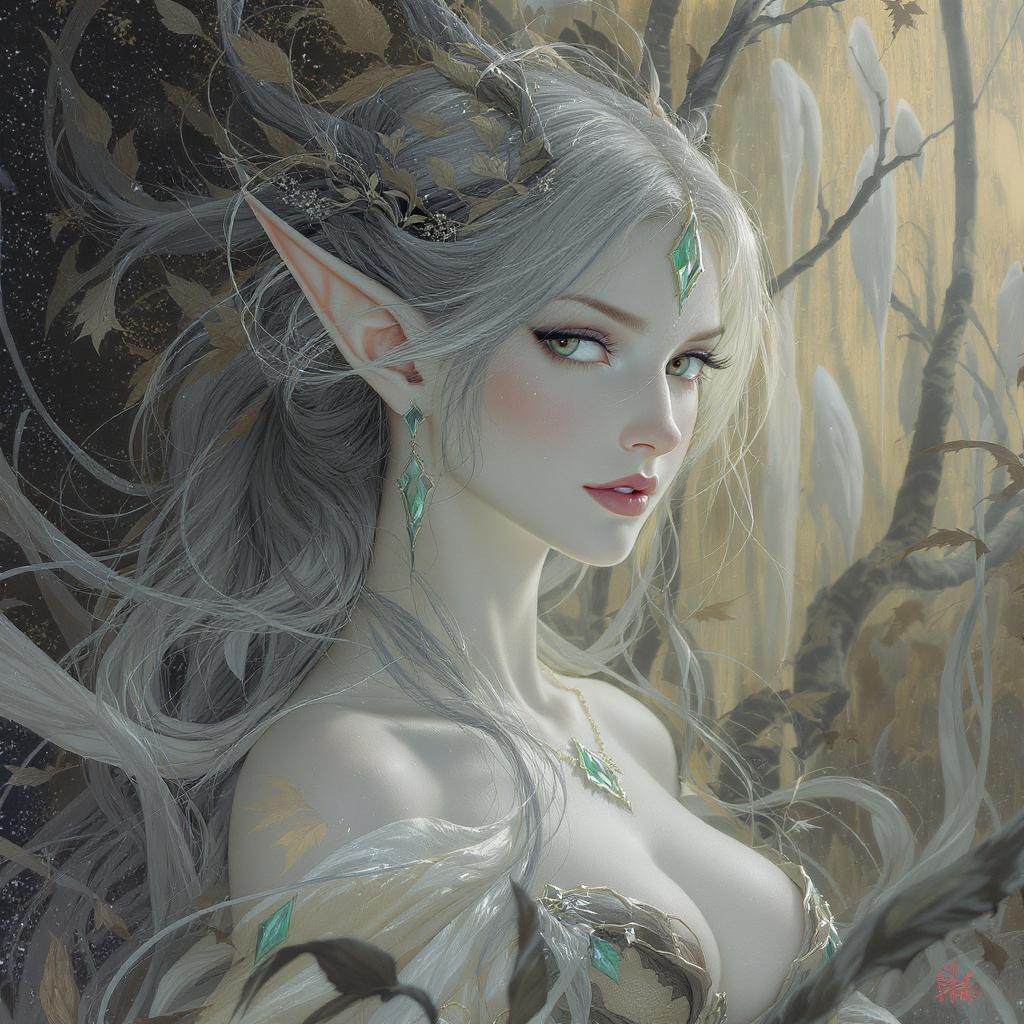 mdjrny-v4 style portrait of an enchanting female elf with delicate features, exquisitely intricate and elegant, showcasing a highly detailed digital painting style. The artwork embodies the essence of concept art and is reminiscent of artstation quality, with a smooth yet sharp focus. The illustration combines the artistic influences of Artgerm, Greg Rutkowski, and Alphonse Mucha, and is rendered in breathtaking 8k resolution. Her flowing hair cascades like a waterfall, interwoven with shimmering strands of silver and emerald, and her attire is adorned with intricate leaf patterns, adding a touch of nature's grace to her ethereal presence.