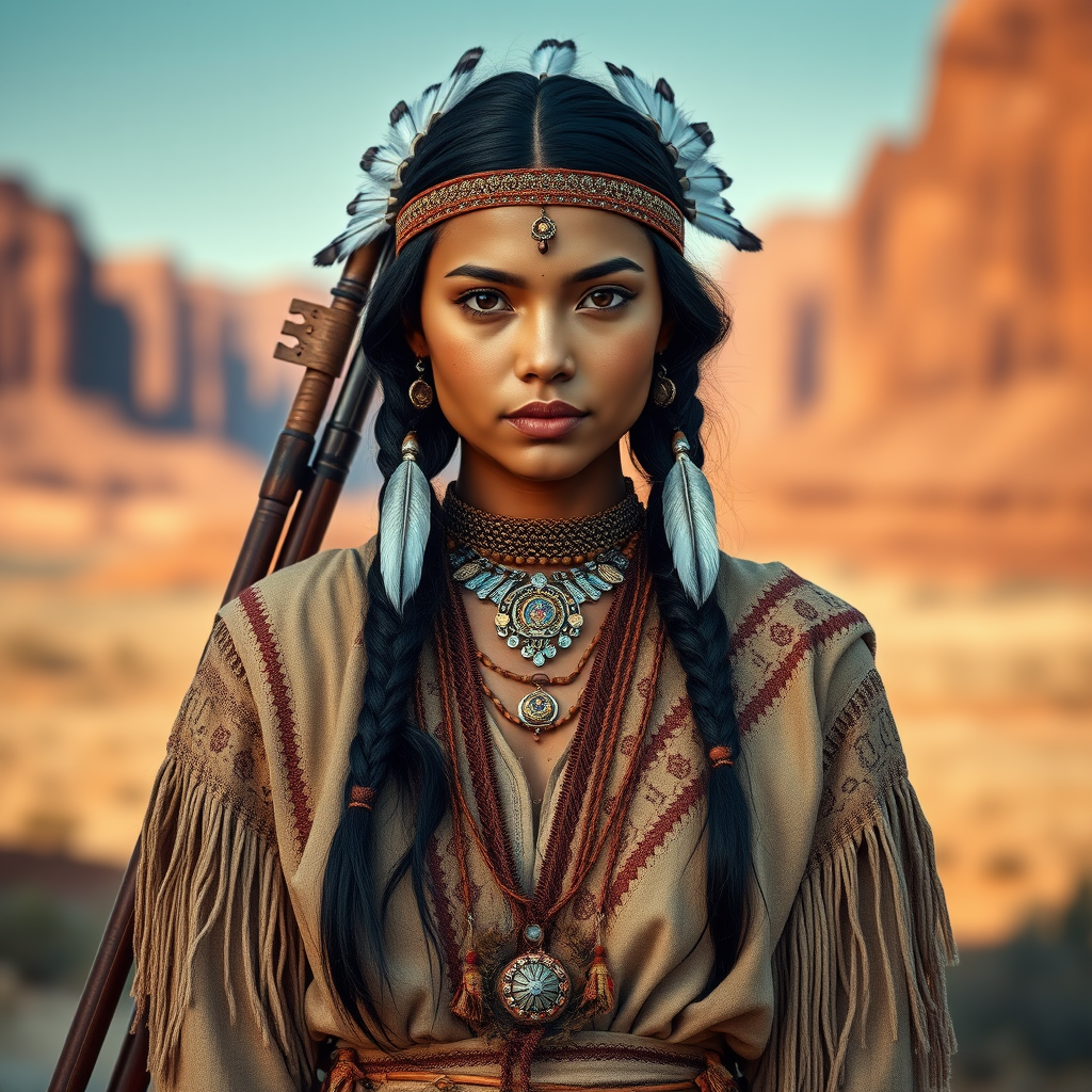 mdjrny-v4 style portrait photograph of a young beautiful Native American woman styled as a modern Pocahontas, featuring a perfect symmetrical face with feather jewelry and a traditional handmade dress. She embodies the strength of an armed female hunter warrior set against a stunning Utah landscape. The image is ultra-realistic, blending concept art and elegance with influences from artists like Artgerm, Greg Rutkowski, and Alphonse Mucha. It showcases an atmospheric depth of field and high-resolution detail in 8k, highlighting her connection to the land and her fierce spirit.